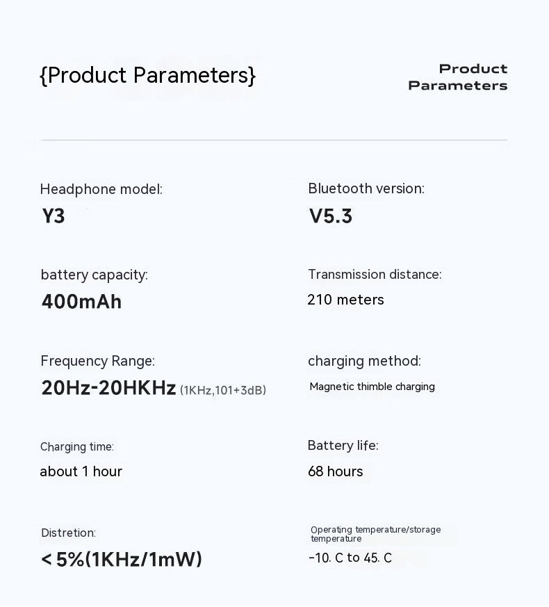 Grâce à une connectivité Bluetooth avancée, les écouteurs Y3 offrent une connexion transparente avec vos appareils, offrant un son clair et équilibré. La conception ergonomique assure un ajustement sûr, tandis que la construction légère permet une utilisation prolongée sans inconfort. Que vous écoutiez de la musique, preniez des appels ou participiez à des conversations, les écouteurs Y3 offrent une expérience d'écoute confortable et immersive.